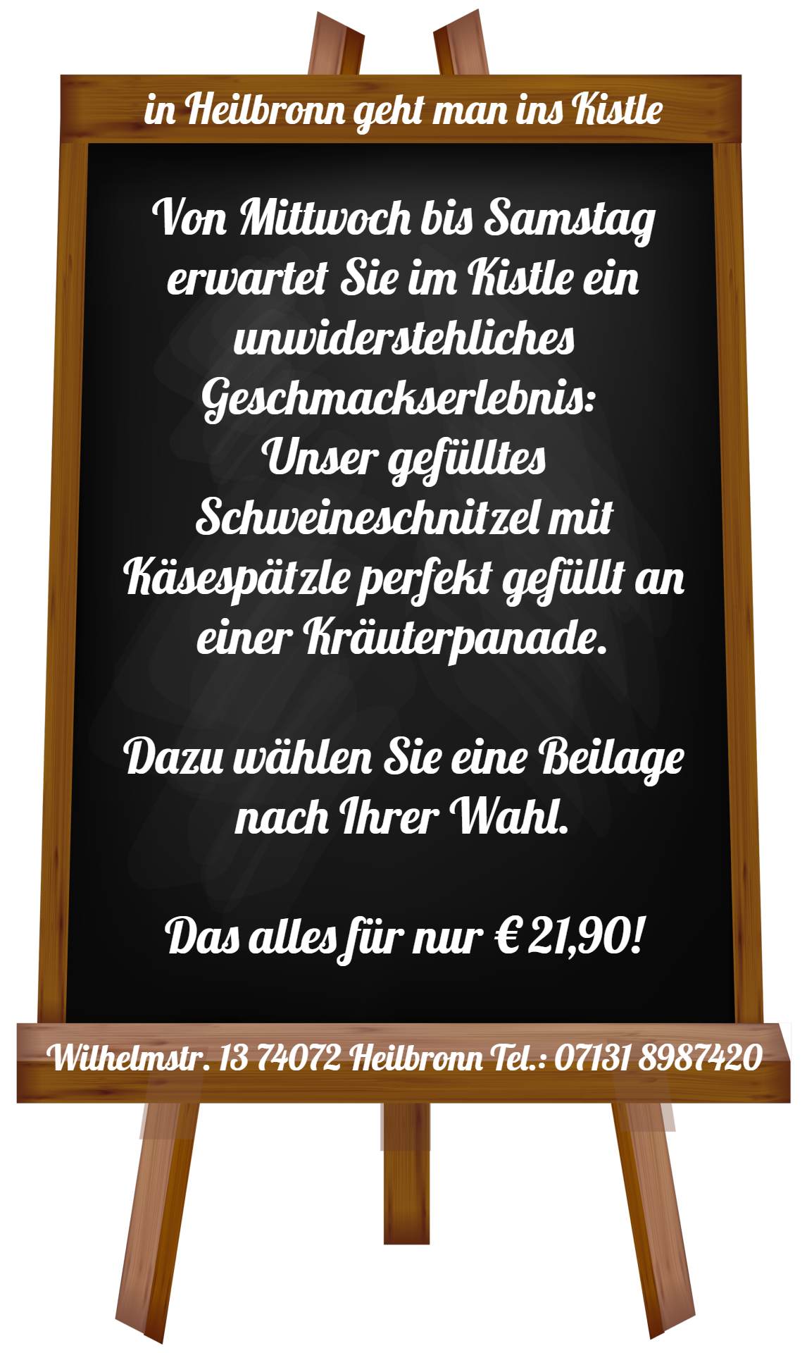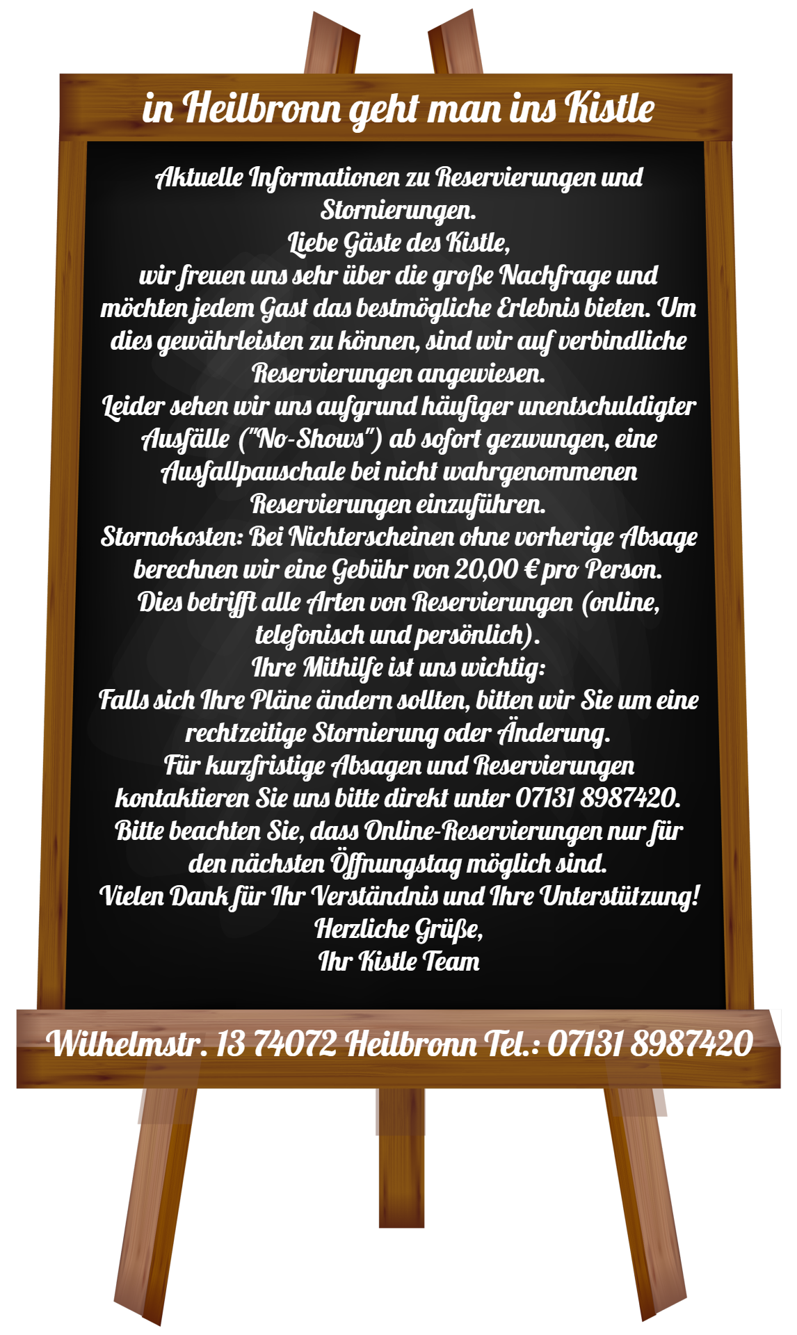 email: info@kistle.de online Reservierung: https://app.resmio.com/ins-kistle/widget. Bitte beachten Sie, dass online Reservierungen nur für den nächsten Öffnungstag möglich sind. Für kurzfristige Reservierungen rufen Sie uns bitte an 07131 8987420.