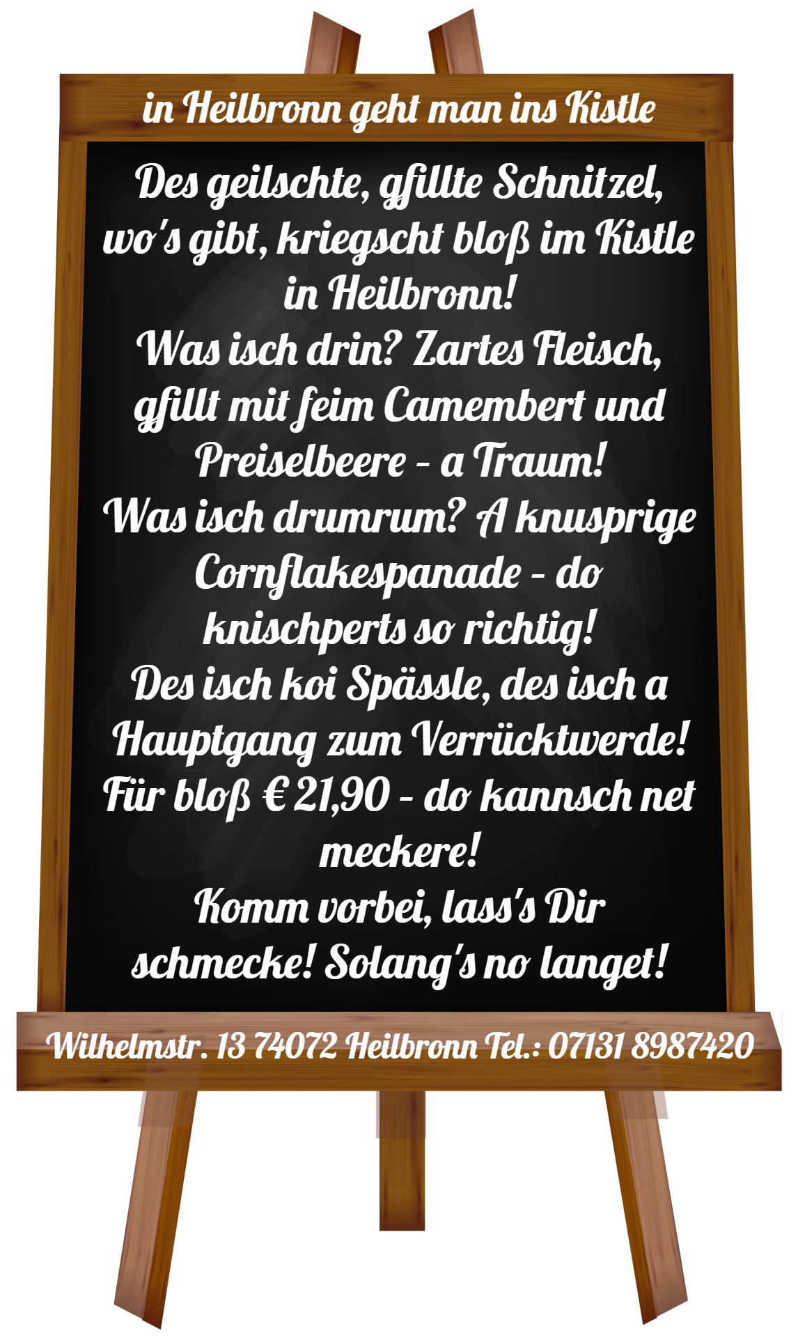 Seit 20 Jahren verwöhnt das "ins Kistle" in Heilbronn seine Gäste mit traditioneller schwäbischer Küche, hausgemachten Spezialitäten wie Kartoffelsalat und Spätzle sowie zarten Rostbraten.