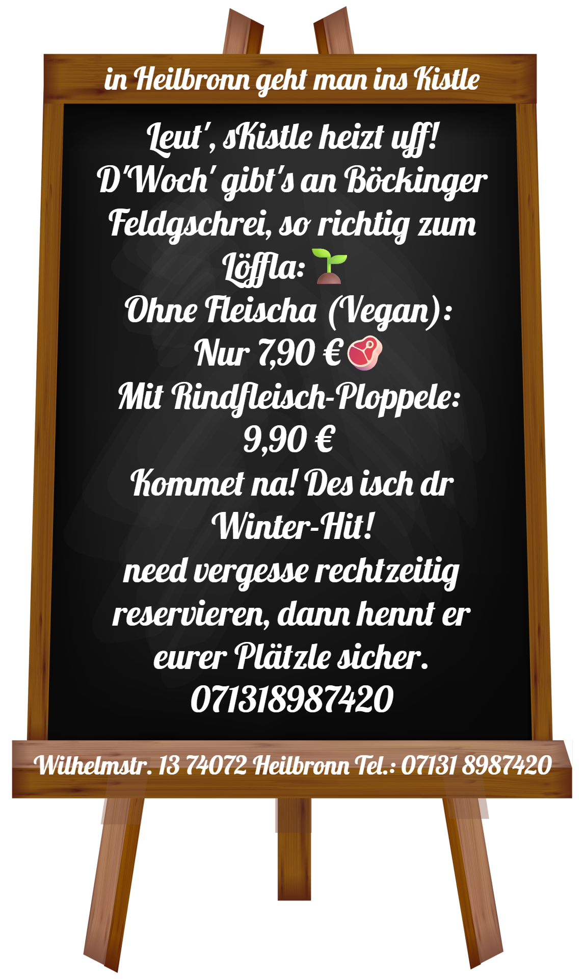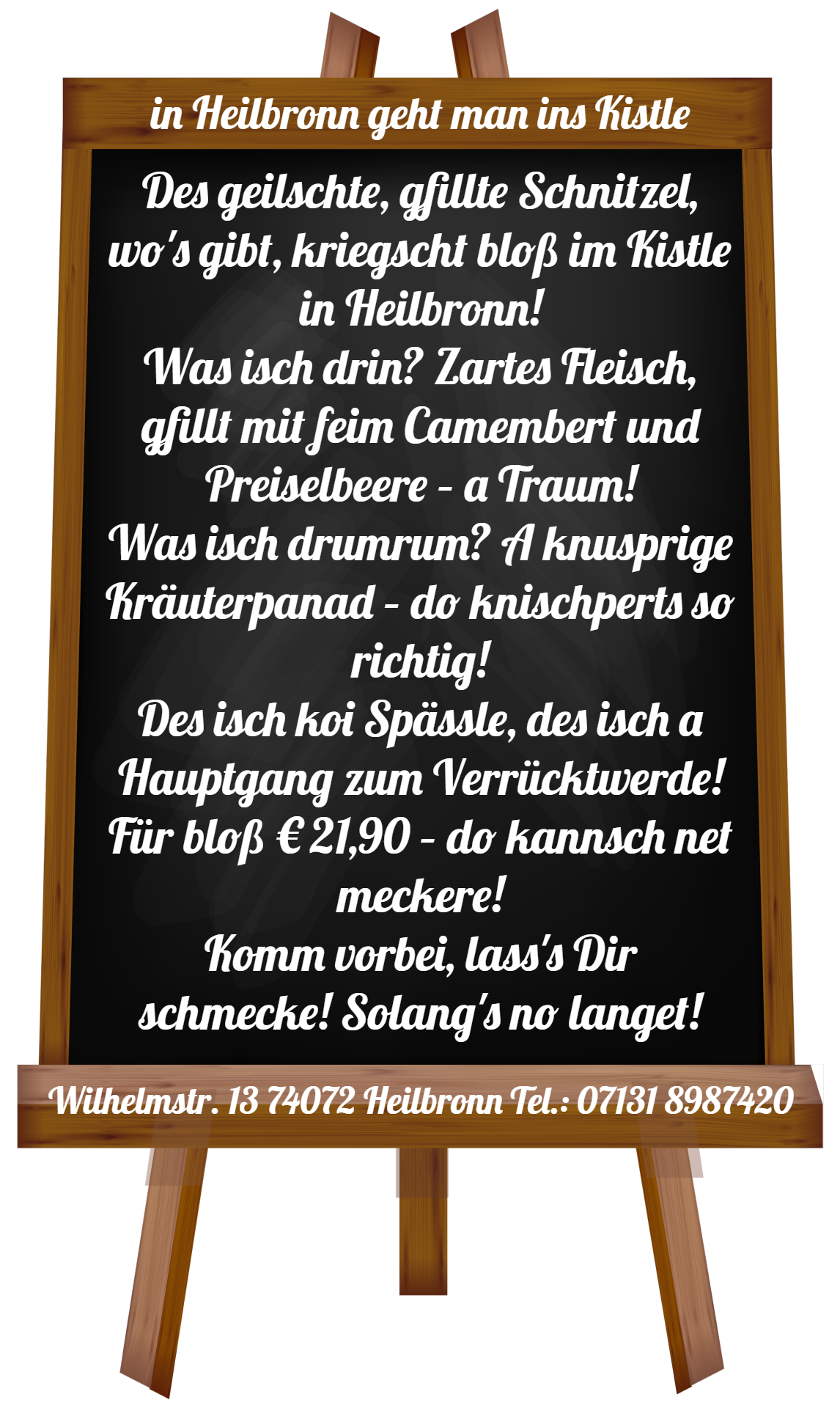 Seit 20 Jahren verwöhnt das "ins Kistle" in Heilbronn seine Gäste mit traditioneller schwäbischer Küche, hausgemachten Spezialitäten wie Kartoffelsalat und Spätzle sowie zarten Rostbraten.